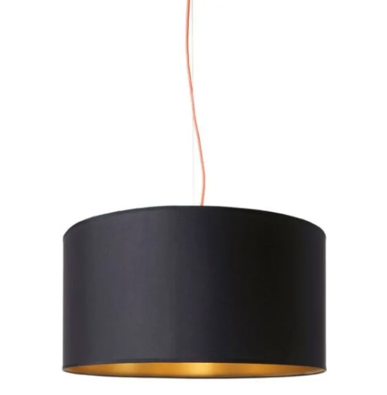 Lampen har en sort stofskærm med en guldfinish på indersiden, hvilket giver et smukt og blødt lys.