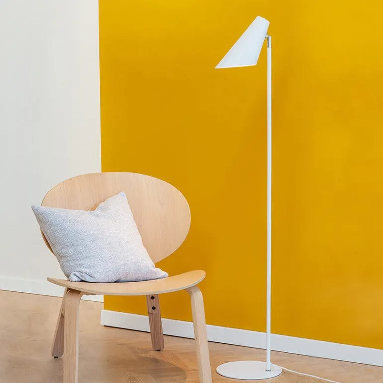 Gulvlampen har et minimalistisk design og passer flot ind i stuen. Lampehovedet kan roteres i den ønskede retning, hvortil afbryderen er placeret på lampehovedet.