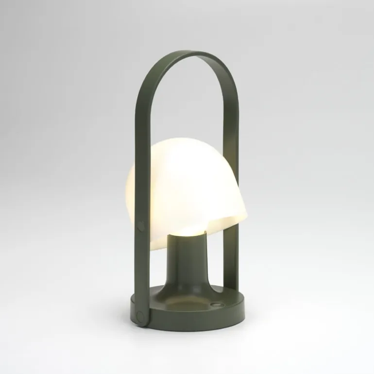 FollowMe lampens materialer er hvid polycarbonat og håndtag i grøn, som komplimenterer hinanden rigtig godt.