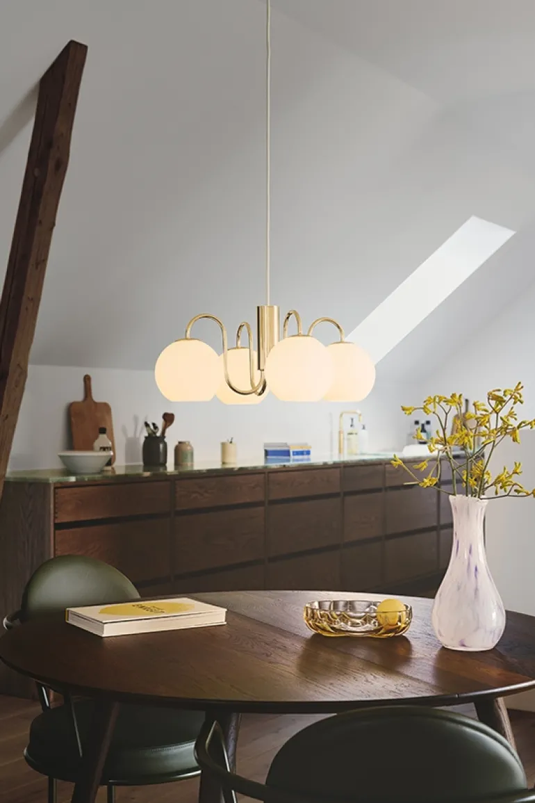 Franca-serien har et eksklusivt og elegant design udført i smukt blankt glas og skinnende messing. Pendlen henter inspiration fra den klassiske lysekrone samt kombinerer vintagedetaljer med et moderne twist. De hvide glaskupler skaber et blødt og diffust lys. Pendlen er derfor også rigtig smuk over et spisebord eller sofabord.