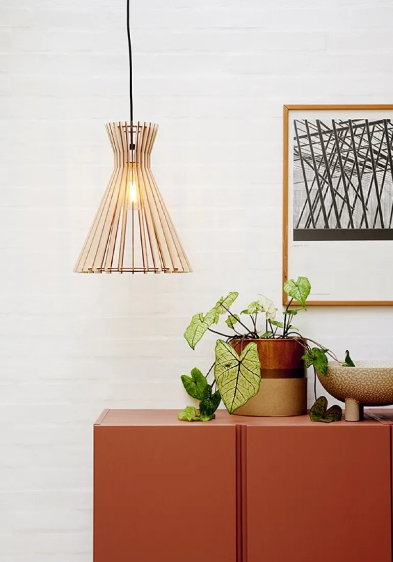 Groa pendlen findes i sort og i træ. Træstrukturen giver et smukt skyggespil i rummet og lader en masse lys strømme igennem.