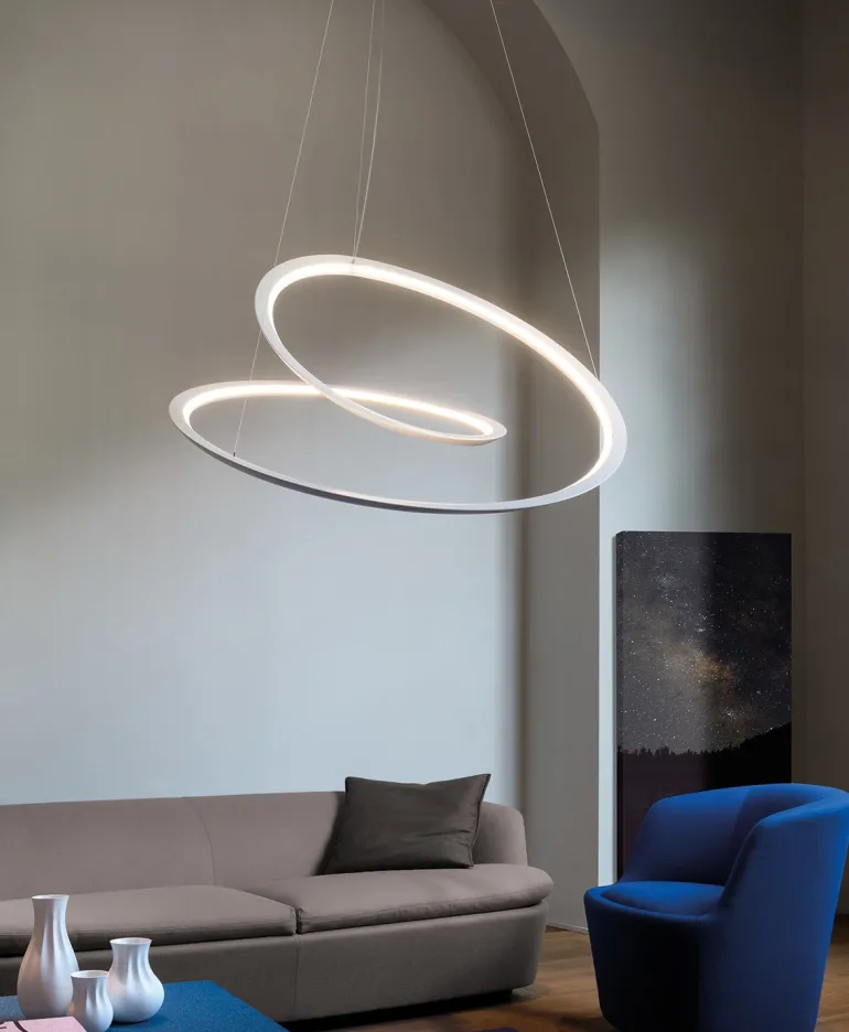 Kepler up pendel har opadgående lys. Kepler lampeserien findes i Kepler, Kepler Minor og Kepler petite: Findes i farverne hvid, guldfarvet og sort.