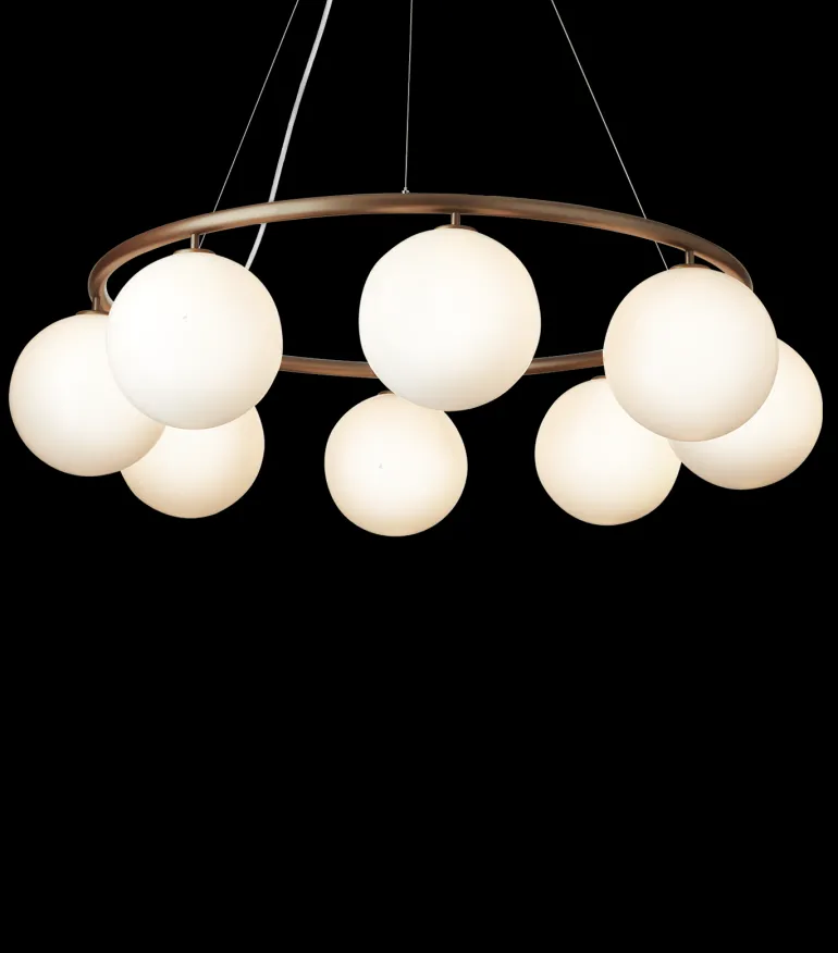 Miira 8 Circular med otte glaskupler har en diameter på 100 cm, Den større lysekrone er særligt egnet over det store eller som flot belysning i den store