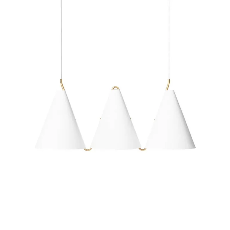 Lampeskærmens overflade består af mat malet stål, der flot kombineres af messingdetaljer, som bringer varme til lampen. De tre kegleformet skærme får lyset til at vende nedad og giver et bredt lysspektrum under sig.