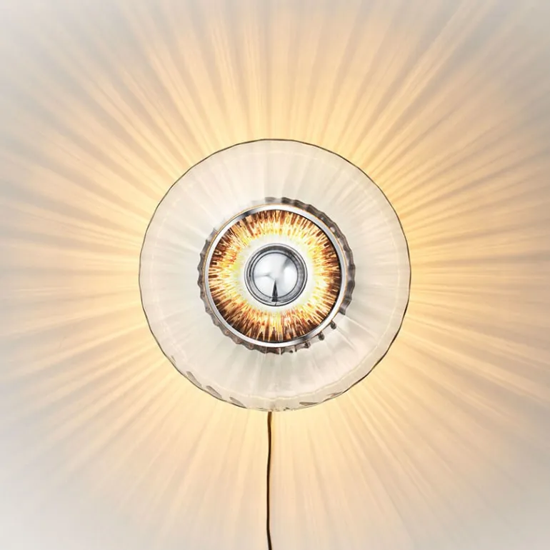 Skærm i smoke, rosa eller klart håndmalet glas med sølvkant og top i lakeret aluminium.