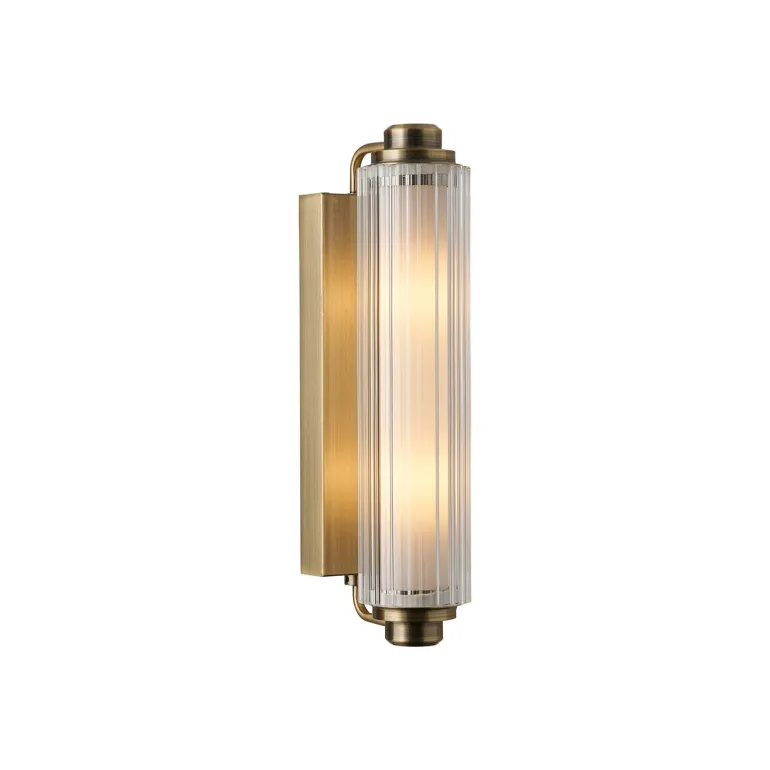 Nimal Double med finish i messing er med sin IP44-klassificering velegnet til badeværelser og andre indendørs miljøer. Benyt eksempelvis den elegante , hvor designet i Art Deco-stil med en smuk riflet skærm både vil være dekorativt og sikre et behageligt lys.
