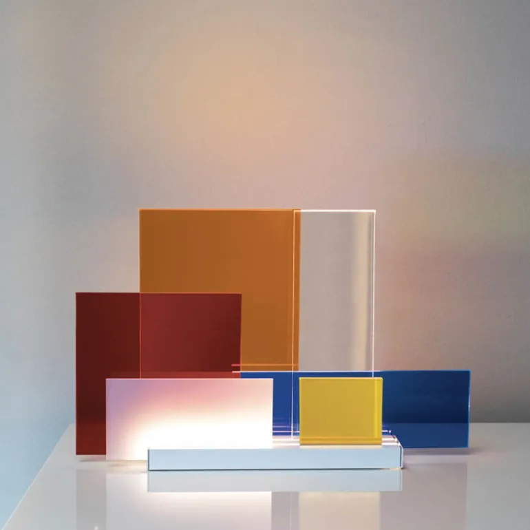 Det er muligt at omrokere de farvede plader i methacrylat, så man kan være med til at bestemme lysets konfiguration.