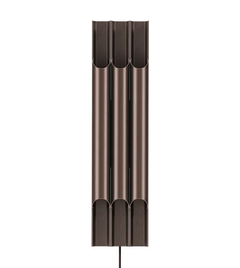 Pan 50 III er et smukt og dekorativt design fra Bent Karlby inspireret af panfløjten. Lampen giver et flot lysspil på væggen via åbningerne i top og bund af de tre blanke lysrør i anodiseret aluminium med bronzefinish. De to lyskilder i hvert lysrør sikrer et ensartet blødt lys fra top og bund.