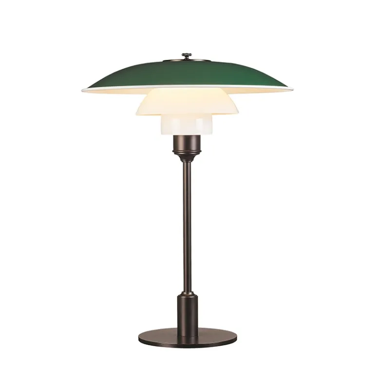 PH 3½-2½ bordlampen findes med topskærm i pulverlakeret grøn, optrukket aluminium, hvor skærmholder og stander er silkemat brun messing.