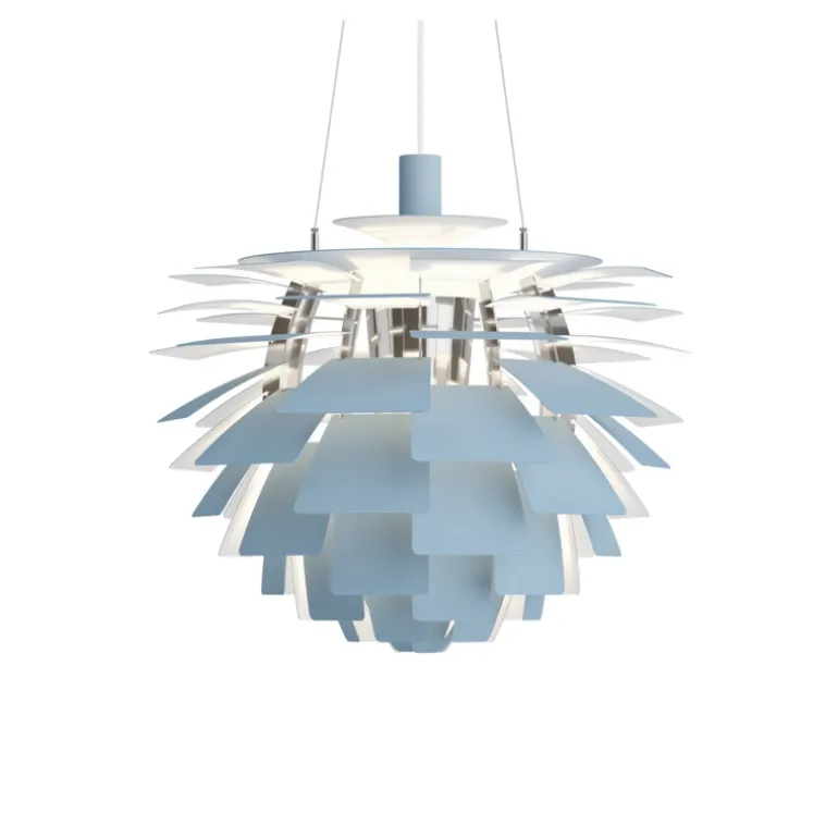 Den unikke pendel reflekterer lyset både indad og udad, hvilket er med til at udsende det fantastiske lys. Bladene på PH Artichoke i dusty blue/krom er fremstillet af laserskåret stål og har en bleg og støvet grålig-blå farve med kølige undertoner, der giver ro til omgivelserne. Overskærmen er i optrukket stål, stellet er i højglansforkromet stål og ophænget er i optrukket aluminium.
