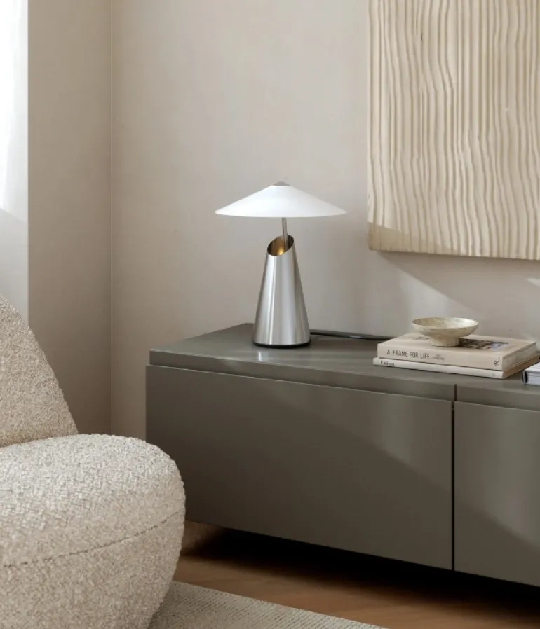 Taido-bordlampen er opbygget af af to geometriske former, der tilsammen skaber en smuk silhuet. Skærmen er spids og rund – og er placeret fint på den koniske base. Lyset reflekteres nedefra op i skærmen og skaber et blødt og diffust lys. Lampehovedet kan justeres i flere retninger, så du selv kan indstille lyset efter ønske. Sæt f.eks. Taido bordlampen i din stue eller dit kontorbord.