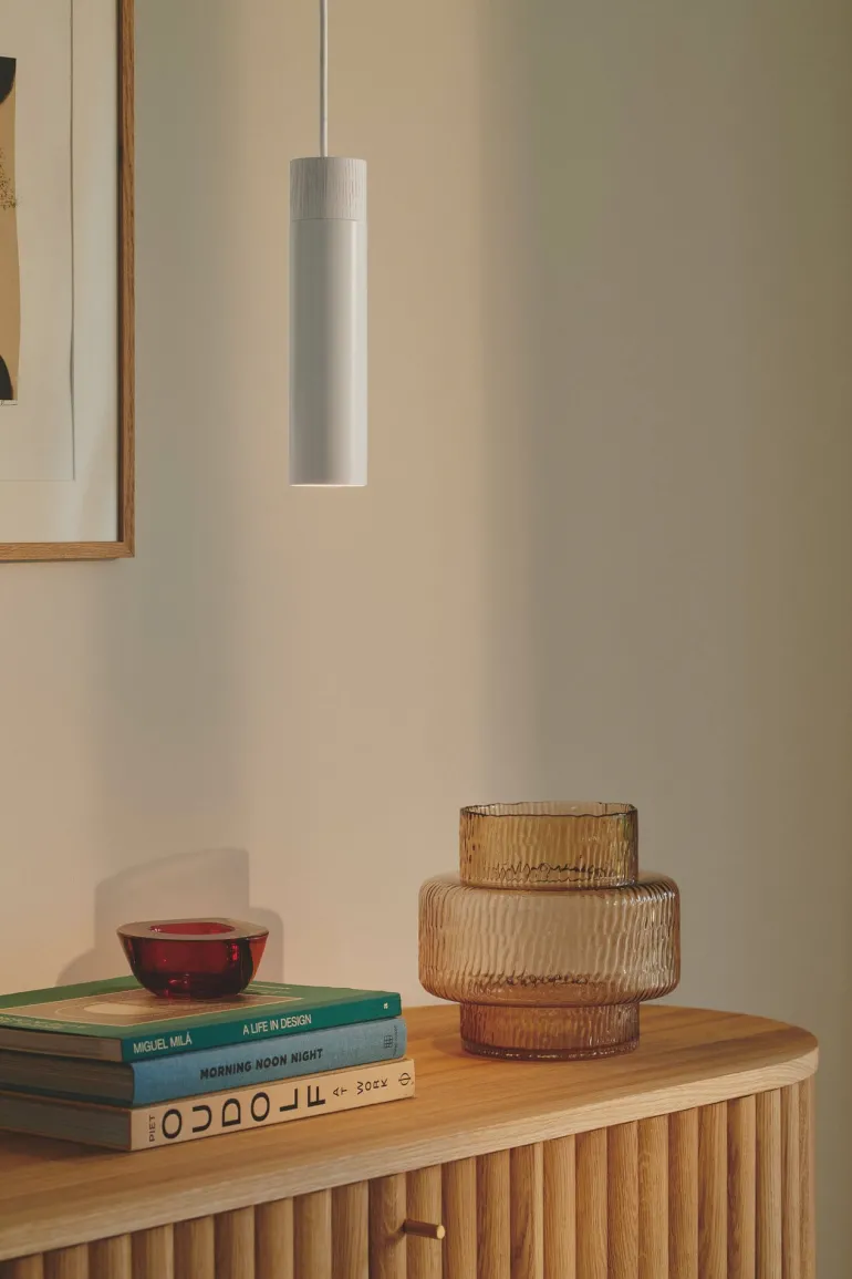 Denne variant i hvid med matchende stilfuld trætop har en alsidig anvendelse, som gør den perfekt til at oplyse dit spisebord eller køkkenø, opfriske et mørkt hjørne i stuen eller som en erstatning for en væglampe eller bordlampe ved siden af sengen. Giv dit hjem en moderne og funktionel opgradering med Tilo.
