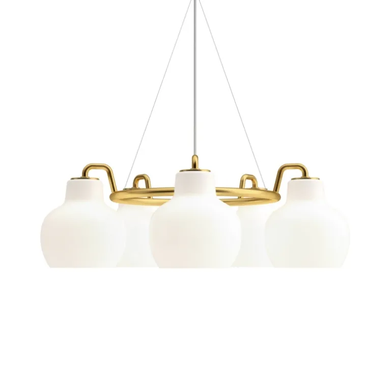 VL Ringkrone afgiver et behageligt og varmt lys, der vil passe ind i enhver indretning. Skærmene er af mundblæst opal trelagsglas med ophæng og baldakin i ubehandlet poleret messing, som kommer til at patinere. Pendlerne findes med en, tre, fem eller syv skærme.