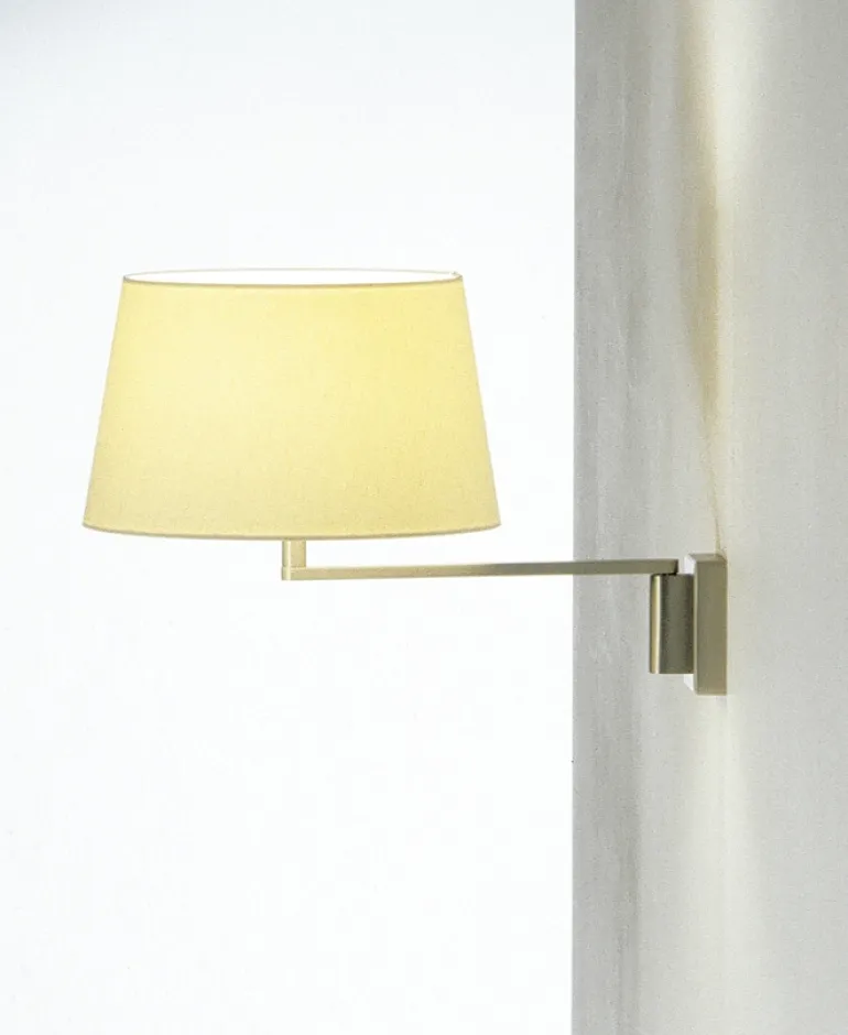 Væglampen er fra den meget stilrene serie “Americana” fra Santa & Cole, som også inkluderer en – samt . Væglampen er lavet i nikkel, med en roterende arm og hvid linned lampeskærm, så du selv kan justere på lampen efter ønske. Perfekt til læsning.