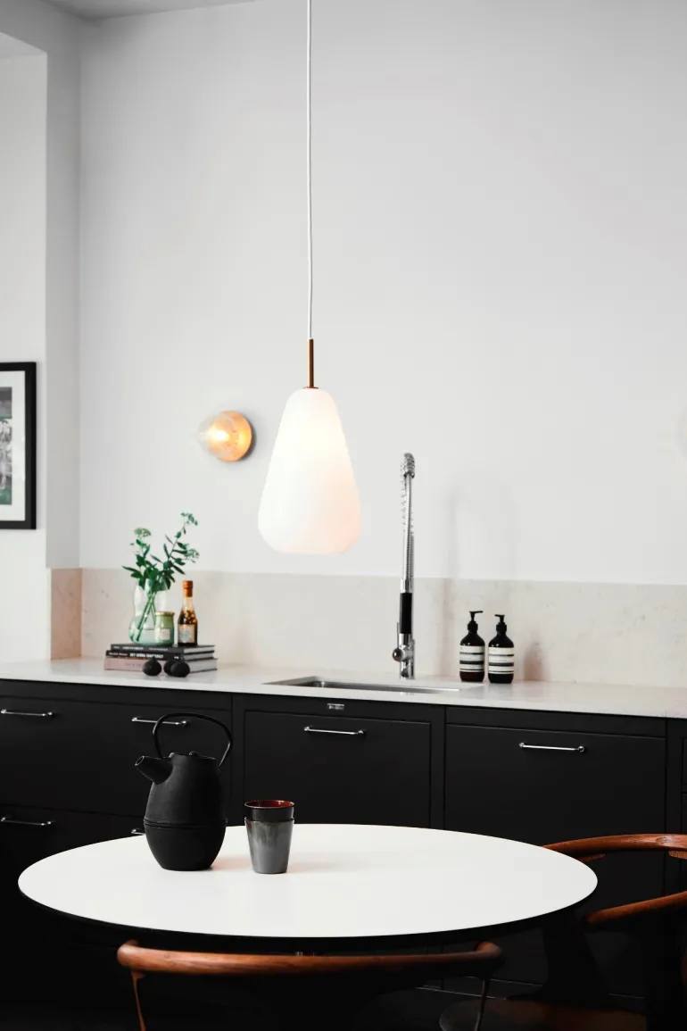 De elegante Anoli-pendler i er i blankt opal mundblæst glas og giver associationer til et fredfyldt sneklædt vinterlandskab. Det snehvide glas fremhæver pendlens enkle linjer samt fremhæver den enkle dråbeform, der fordeler det bløde og jævne lys på fineste vis.