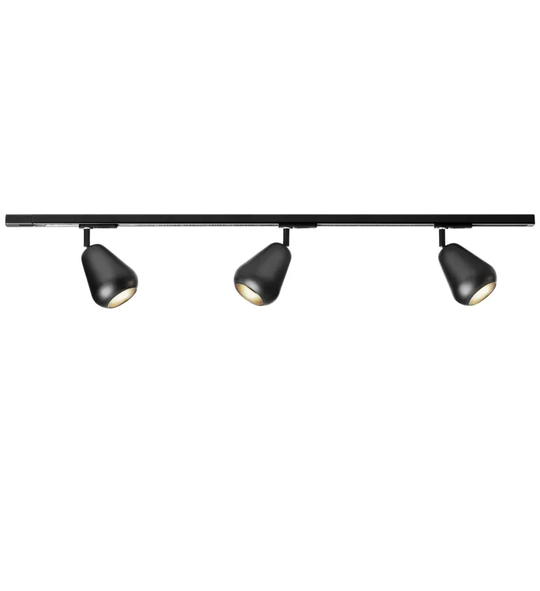 Anoli Track skinnen med tre spots er ideel som i rum med behov for spotlys af høj kvalitet. Metalskærmen har referencer til regndråbens formsprog og er placeret på en justerbar arm. Den gør det sammen med placeringen på skinnen muligt at justere lamperne, så det blændfri arbejdslys kan målrettes. Benyt Anoli i køkkenet eller i et andet rum med behov for et godt spotlys.