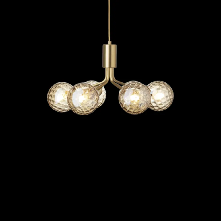 Apiales 6 består af seks mundblæste glaskupler samt gylden børstet messing / Brushed Brass. Fra en specialproduceret kappe folder de fine rør sig ud som blomsterstilke med de mundblæste glas.