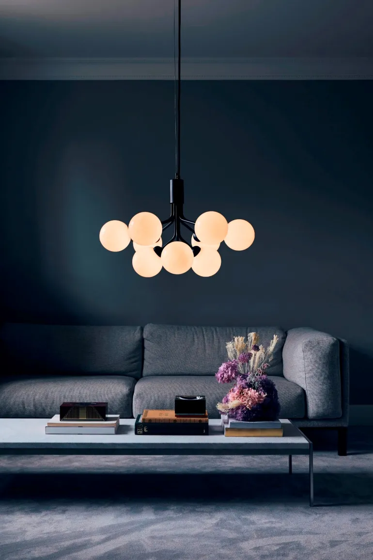 Apiales 9 består af ni mundblæste glaskupler og fås i gylden Brushed Brass Finish eller Satin Sort. Fra en specialproduceret kappe folder de fine rør sig ud som blomsterstilke med de mundblæste glas.