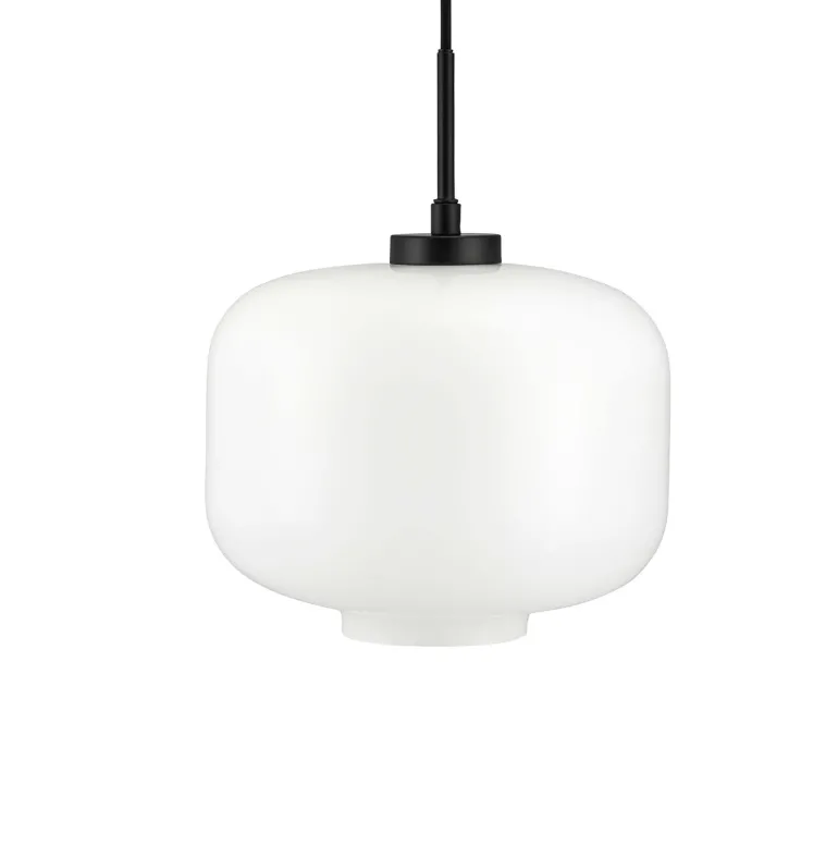 Arp med lampeskærm i opalglas og ophæng i mat sort metal er klassik design med et behageligt lys. Lampen passer i både moderne og klassiske indretninger og kan hænge alene eller flere samlet i , , eller ethvert andet sted med behov for god belysning.