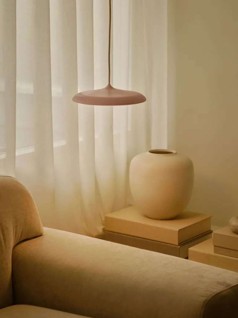 har et minimalistisk og tidløst design inspireret af bækkenet til et trommesæt. Skærmen sikrer lampen et blødt og diffust lys, der hvor den hænges. Artist er med integreret dæmpbar LED – og lysstyrken kan derfor ændres efter behov med vægdæmper. Der er 5 års garanti på LED-lyskilden.