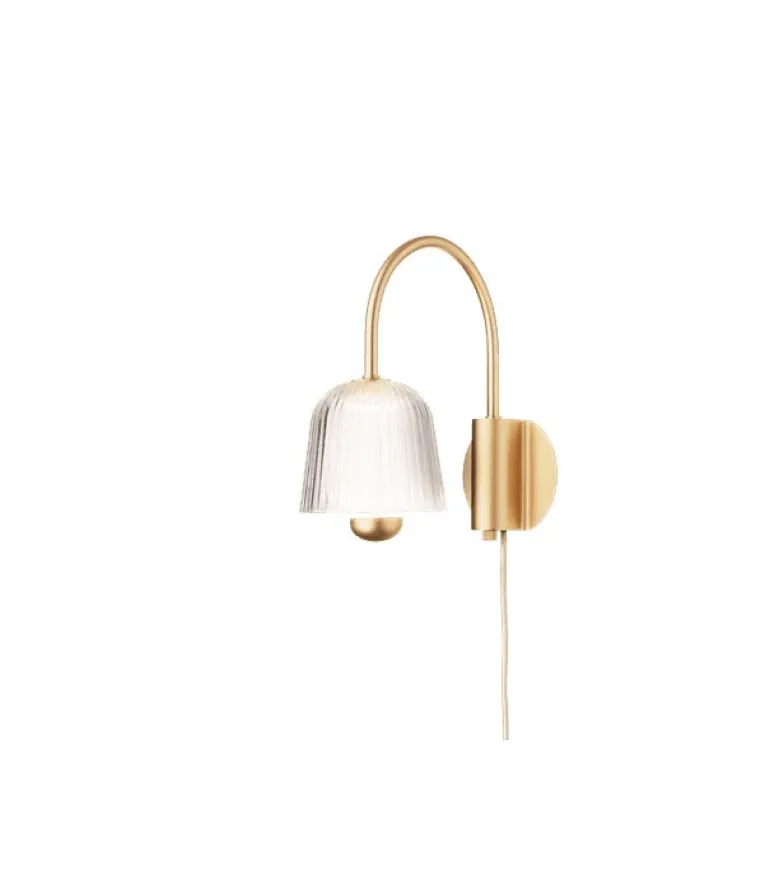 Asteea med lampeseriens karakteristiske klokkeformede akrylskærm og konstruktion med finish i satin messing har et stilfuldt og eksklusivt design. Lampen er dæmpbar og den buede lampearm kan drejes, så lyset kan tilpasses efter behov. Benyt eksempelvis væglampens behagelige lys i stuen, hvor den klare skærms rillede struktur vil bidrage med et levende lysspil og tilføre varme og karakter til rummet.