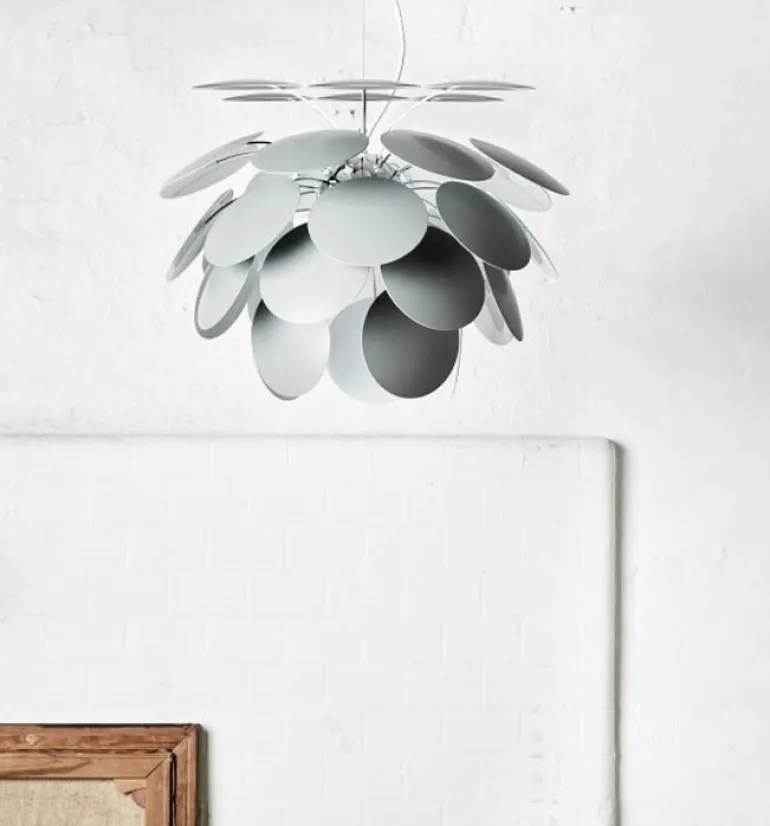 Pendlen er sat sammen af 35 cirkelskiver af ABS-plastik, som giver pendlen dens lette og fine udtryk.