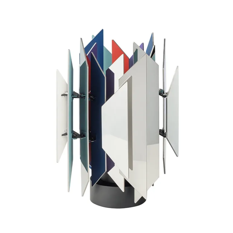 Det særlige ved bordlampen er dens evne til at lave et flot farverigt samspil af lys, der opstår når lyset rammer trapezioderne, der er lakeret i forskellige farver.