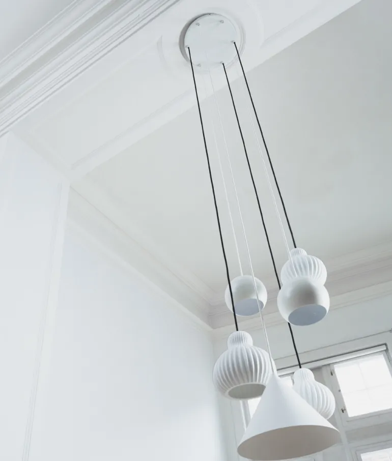 Baldakin i mat hvid til 6 pendler, der kan hænge i en flot klynge.