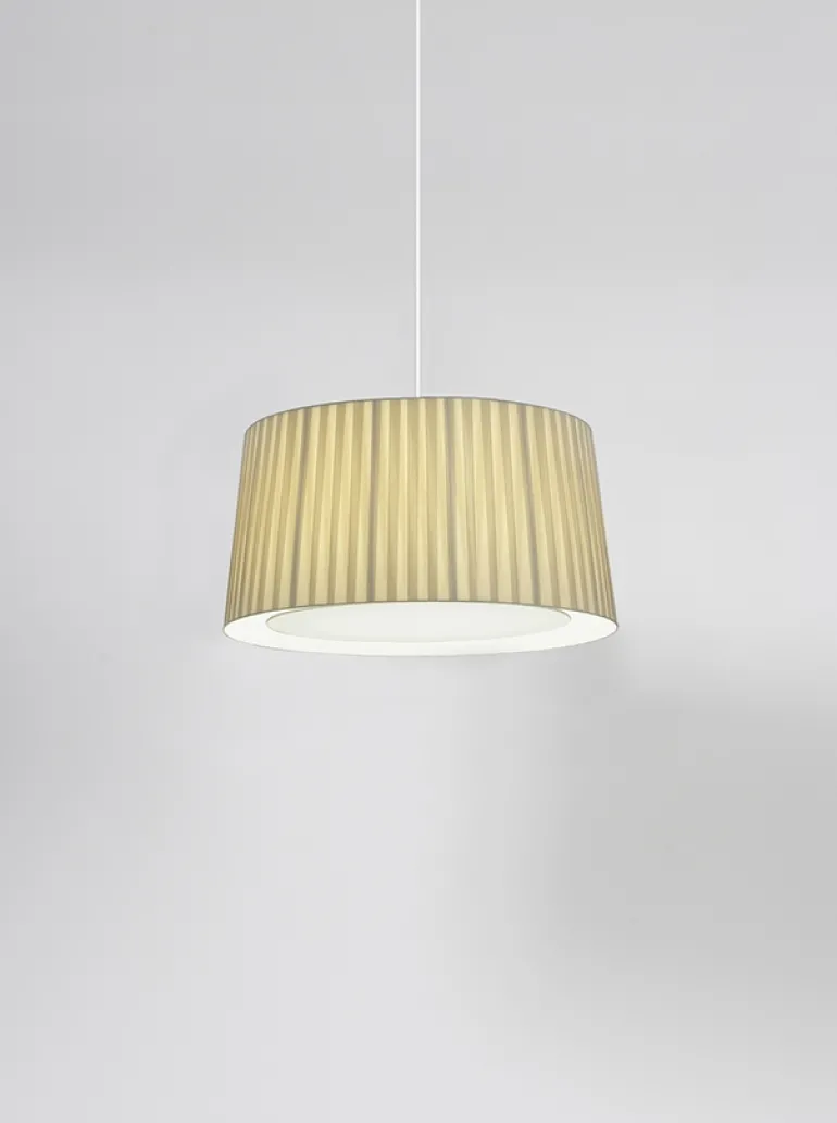 GT6 pendlens skærm er lavet af bogbinderstof, og den er betrukket med bånd af pergamentstof. Denne konstruktion giver en varieret belysning, og når lampen ikke er tændt, fungerer den samtidig som et dekorativt element.