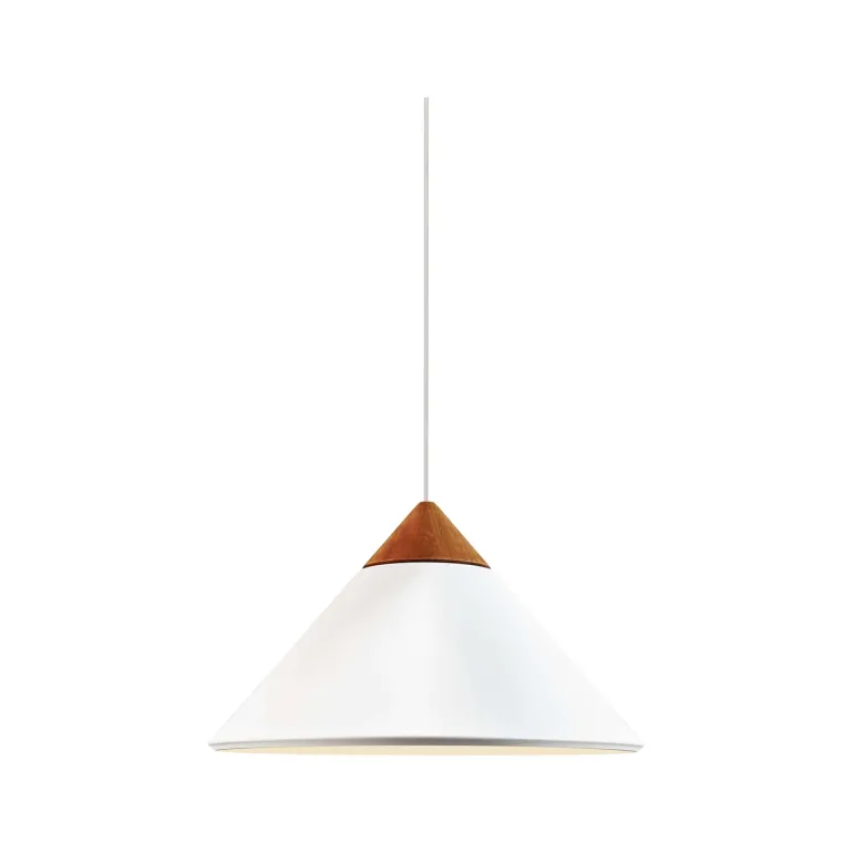 Kinto har et moderne og minimalistisk design med en kegleformet skærm, der vil være perfekt over spisebordet eller køkkenbordet. Ud over et funktionelt nedadrettet lys sendes lyset også op gennem åbningen på toppen af skærmen og skaber en smuk lyseffekt. er i metal med en elegant top i mørk træ og detaljer i bruneret messing.