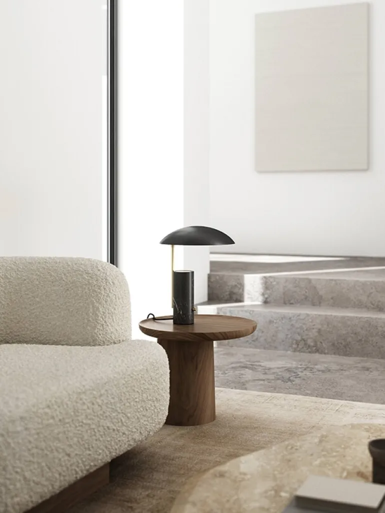 Bordlampen består af en marmorbase, med den opløftede skærm. Lyset reflekteres opad i bunden af skærmen, der dermed skaber en blød og indirekte atmosfære.