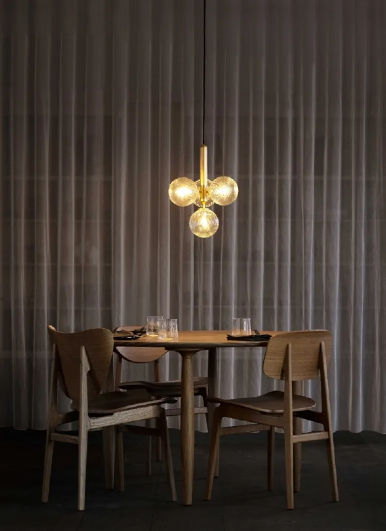 er en lampeserie i et enkelt og tidløst design med nordiske elegance og funktion. Det fine mundblæste glas – og elegante messing – giver designet balance og dybde. Blødt nordisk lys skinner fra det klare glas og giver en enestående atmosfære i rummet.
