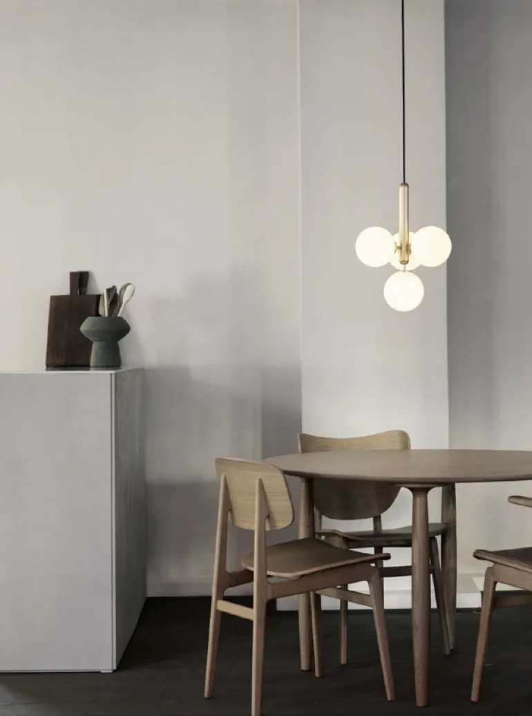 er en lampeserie i et enkelt og tidløst design med nordiske elegance og funktion. Det fine mundblæste glas – og elegante messing – giver designet balance og dybde. Blødt nordisk lys skinner fra det opal-hvide glas og giver en enestående atmosfære i rummet.