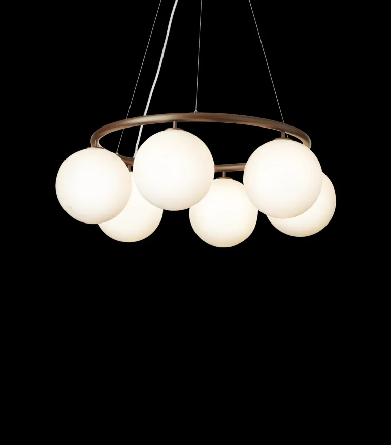 Miira 6 Circular bestående af seks mundblæste glaskupler har en diameter på 80 cm. Det gør lysekronen utrolig oplagt over et spisebord eller sofaområdet.