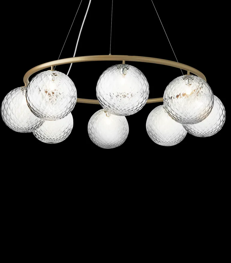 Miira 8 Circular med otte glaskupler har en diameter på 100 cm, Den større lysekrone er særligt egnet over det store spisebord eller som flot belysning i den store