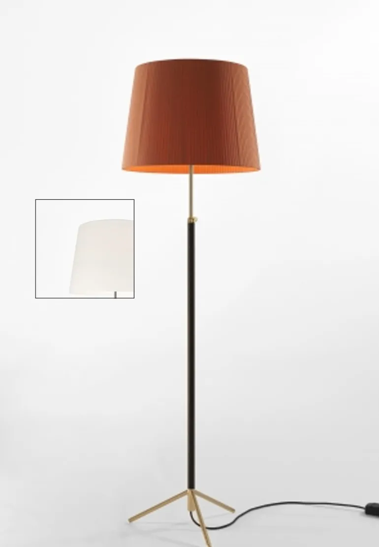 Pie de salón gulvlampen er lavet med fokus på at Jaume Sans kunne bruge dem i sin egen indretning. Justerbar lampe, med et sort læderdækket skaft som gør designet lidt mere luksuriøst. Pie de salón lampen findes i 3 forskellige modeller; G1, G2 og G3. 2 forskellige baser; Messing og krom, og er lavet i et hav af forskellige flotte skærm farver.
