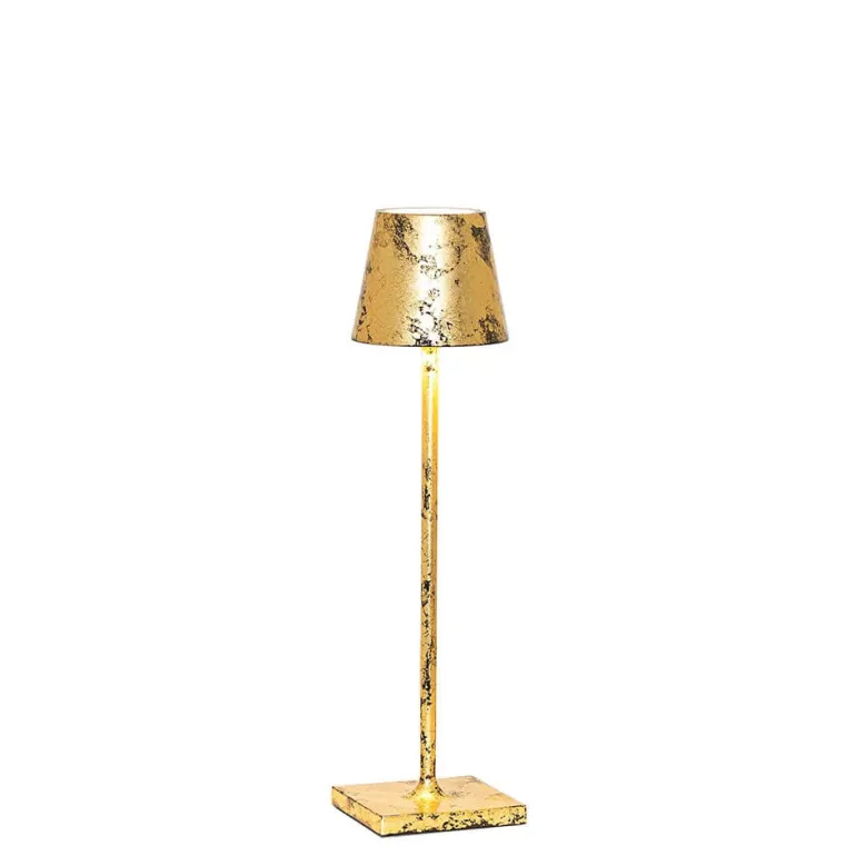 Poldina micro er fremstillet i trykstøbt aluminium og findes med flere forskellige finish, hvor de fleste er designet til at kunne benyttes både indendørs og udendørs. Denne variant i sort/antik guld anbefales sammen med varianterne i rød/antik guld og capriblå/antik guld samt i blank guld og blank krom ikke til kontinuerlig udendørs brug. Alle varianterne skal oplades indendørs.