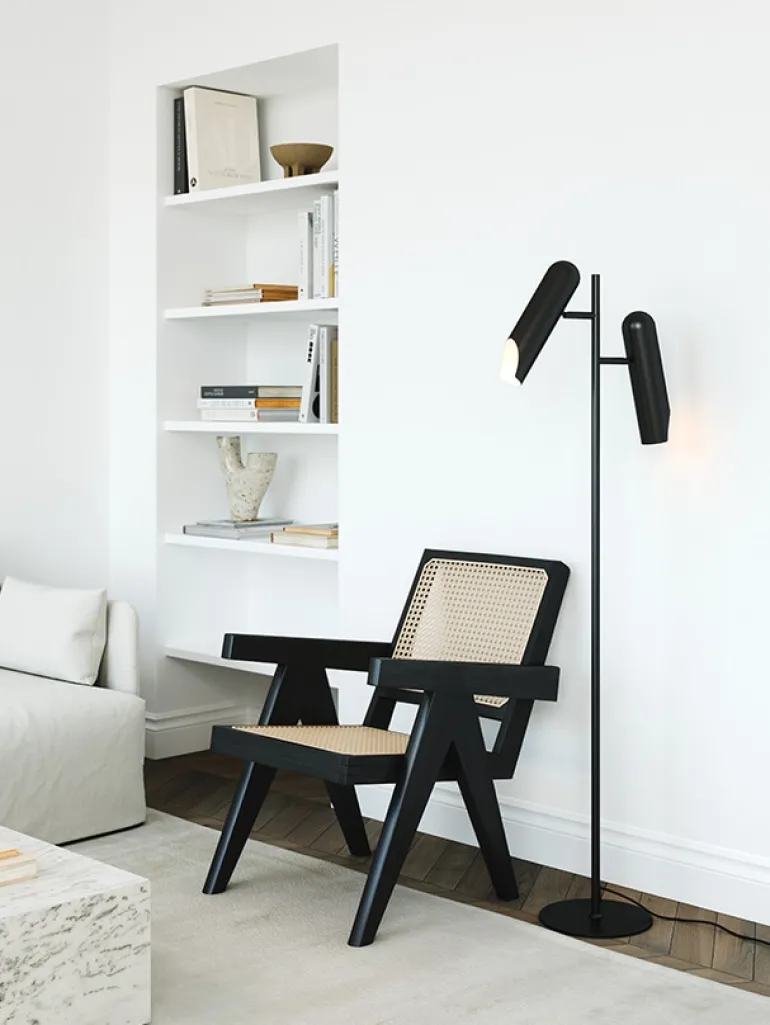 Rochelle-serien er designet af danske Charlotte Høncke. Gulvlampen har et moderne italiensk formsprog, der består af to slanke, skulpturelle lampehoveder. Gulvlampens matte sorte overflade og de aflange lampeskærme giver et stilfuldt udtryk. Lampehovederne er justerbare, og der kan derfor opnås et retningsbestemt lys.