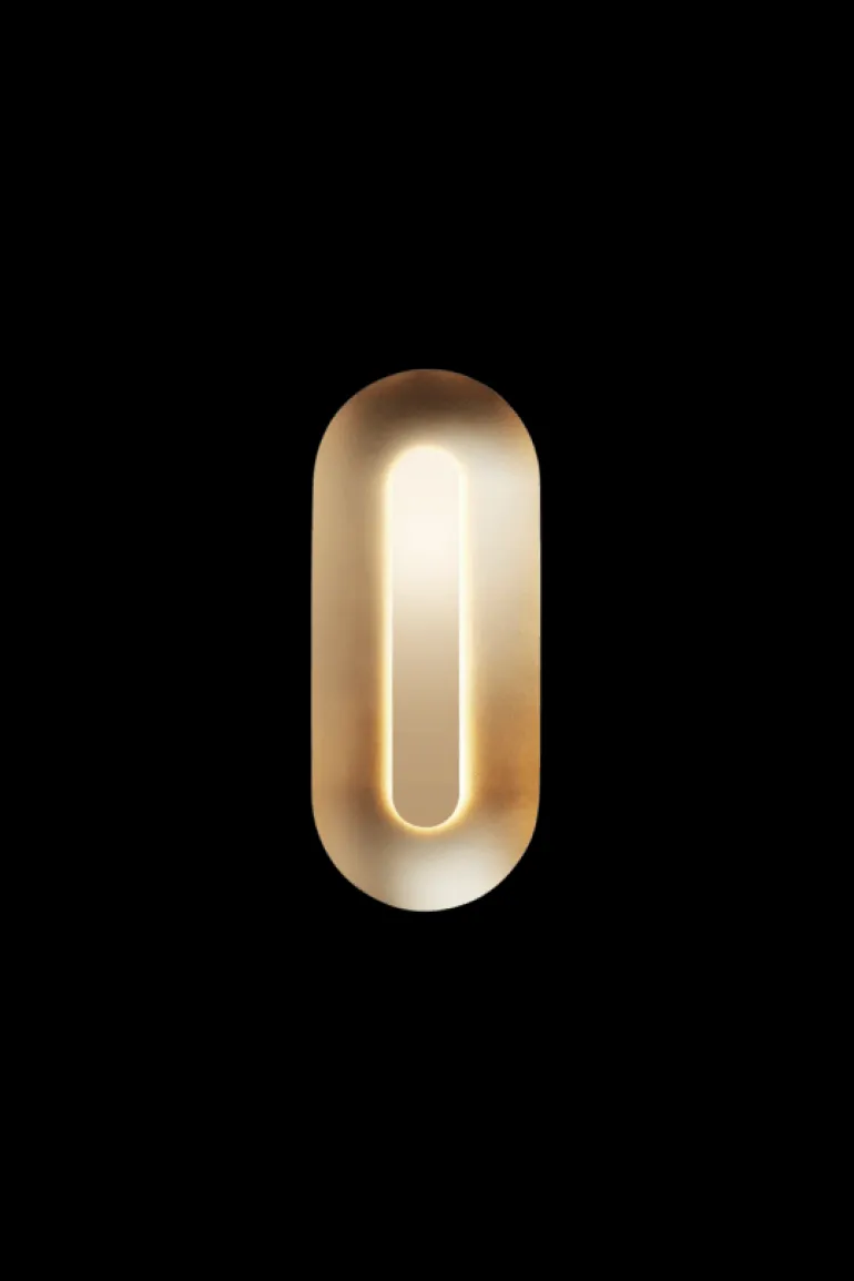 Sasi Large væglampe skaber en smuk dekorativ med sin bløde formgivning, en harmonisk farvepalette og nøje udvalgte materialer. Sasi består af en gylden, oval aluminiumsskærm i børstet messing, som udgør basen – og en mindre form i blankpoleret messing er placeret i midten af lampen. Den blanke skærm dækker det integrerede LED-modul, der spreder og reflekterer et dekorativt lys. Sasi væglampen er smuk både tændt og slukket.