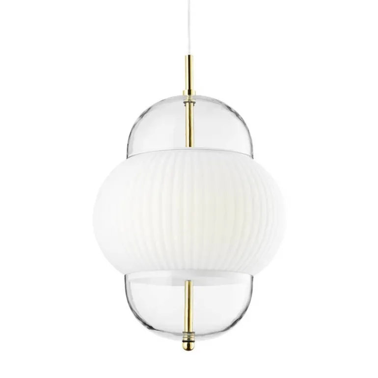 Shahin er en utrolig elegant med flotte detaljer i messing, der består af to glasskærme og et smukt hvidt opalglas i midten.