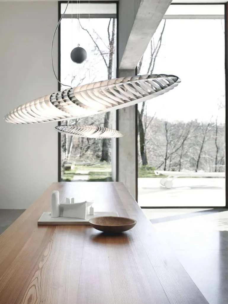 Titania er med sin elliptiske form en elegant fusion af funktion og design. Lyset reflekteres smukt gennem den transparente skærm med lameller i aluminium, der samtidig skjuler pæren. En modvægt mellem skærm og loft tillader højdejustering af skærmen, og de medfølgende filtre i polycarbonat i farverne gul, rosa, lyseblå og violet gør det muligt at skifte farve uden at ændre lampens hvide lys.