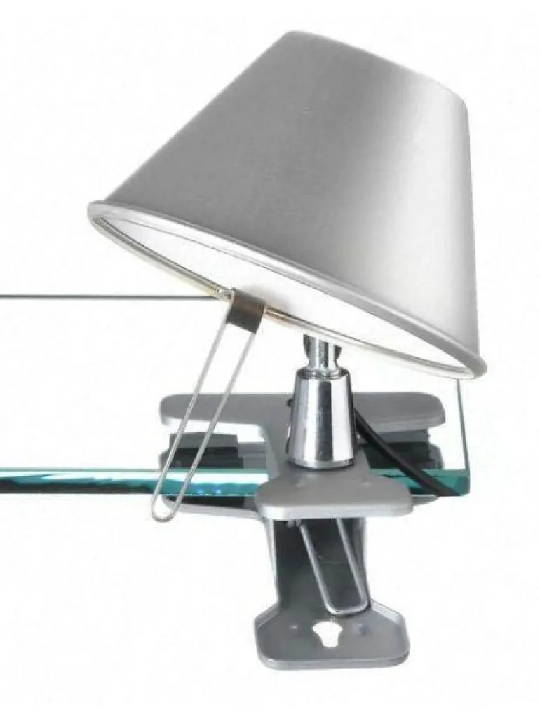 Klemspot med justerbart lampehoved i mat aluminium. Klemme i alufarvet stål.